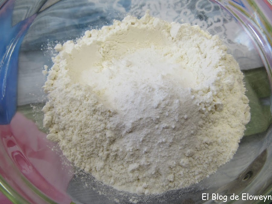 A continuación ponemos en un recipiente los 200 gramos de harina con las dos cucharaditas y media de levadura. En la receta no lo pone, pero es mejor tamizar la harina después de mezclarla con la levadura.