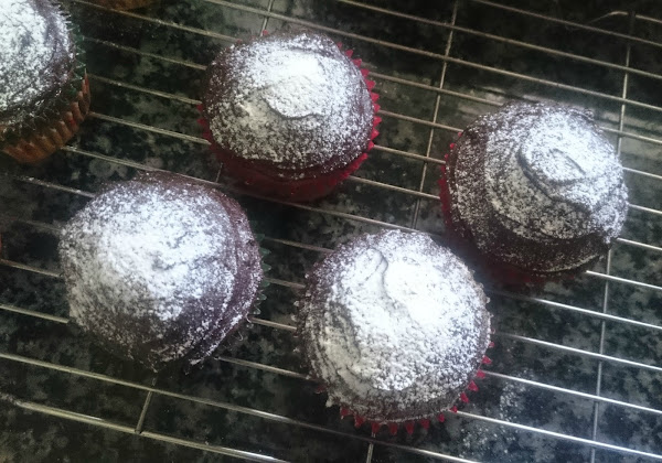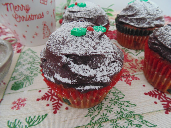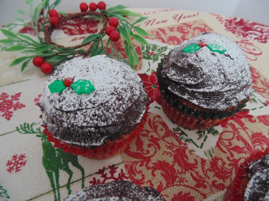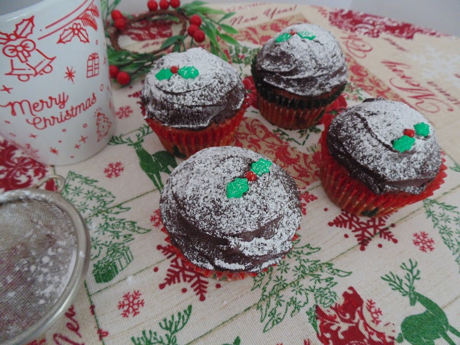 Dejamos enfriar. Para la cobertura disolví el chocolate en el microondas y una vez líquido le añadí 30 ml. de nata (crema de leche) caliente. Dejamos enfriar a temperatura ambiente hasta que espese. Una vez más compacto extendemos en nuestras magdalenas con ayuda de una espátula pequeña. Luego espolvoreamos con azúcar glass y decoramos. Listas!!! Ya ha llegado la Navidad a nuestra cocina y a nuestra casa!!!