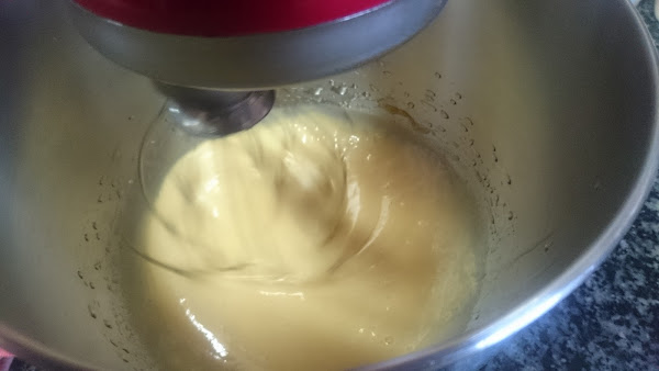 Luego iremos añadiendo el aceite poco a poco para que emulsione nuestra masa. Tamizamos la harina y la levadura y la iremos agregando en varias veces.