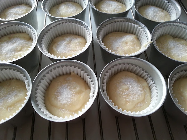 5. - Vamos rellenando las cápsulas con una cucharada sopera, llenándolas 3/4 partes, ya que luego subirán. Y las espolvoreamos con abundante azúcar.