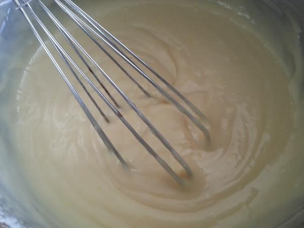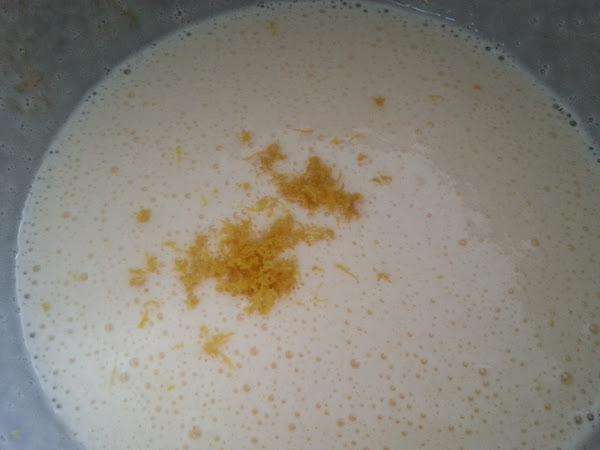 2. - Le añadimos el aceite, la nata (crema de leche) y la ralladura de medio limón y volvemos a batir hasta que esté todo integrado.