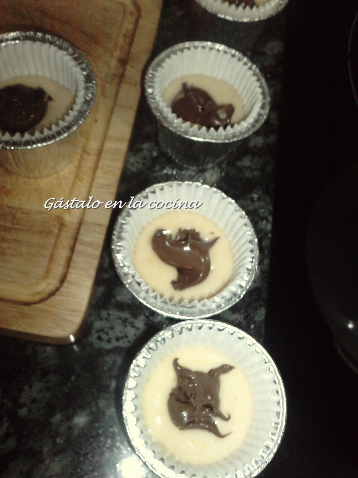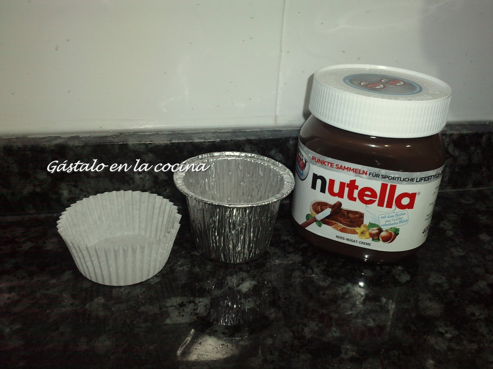 Metemos el molde de papel dentro del otro, llenamos un poco con masa y luego con un poco de crema de cacao.