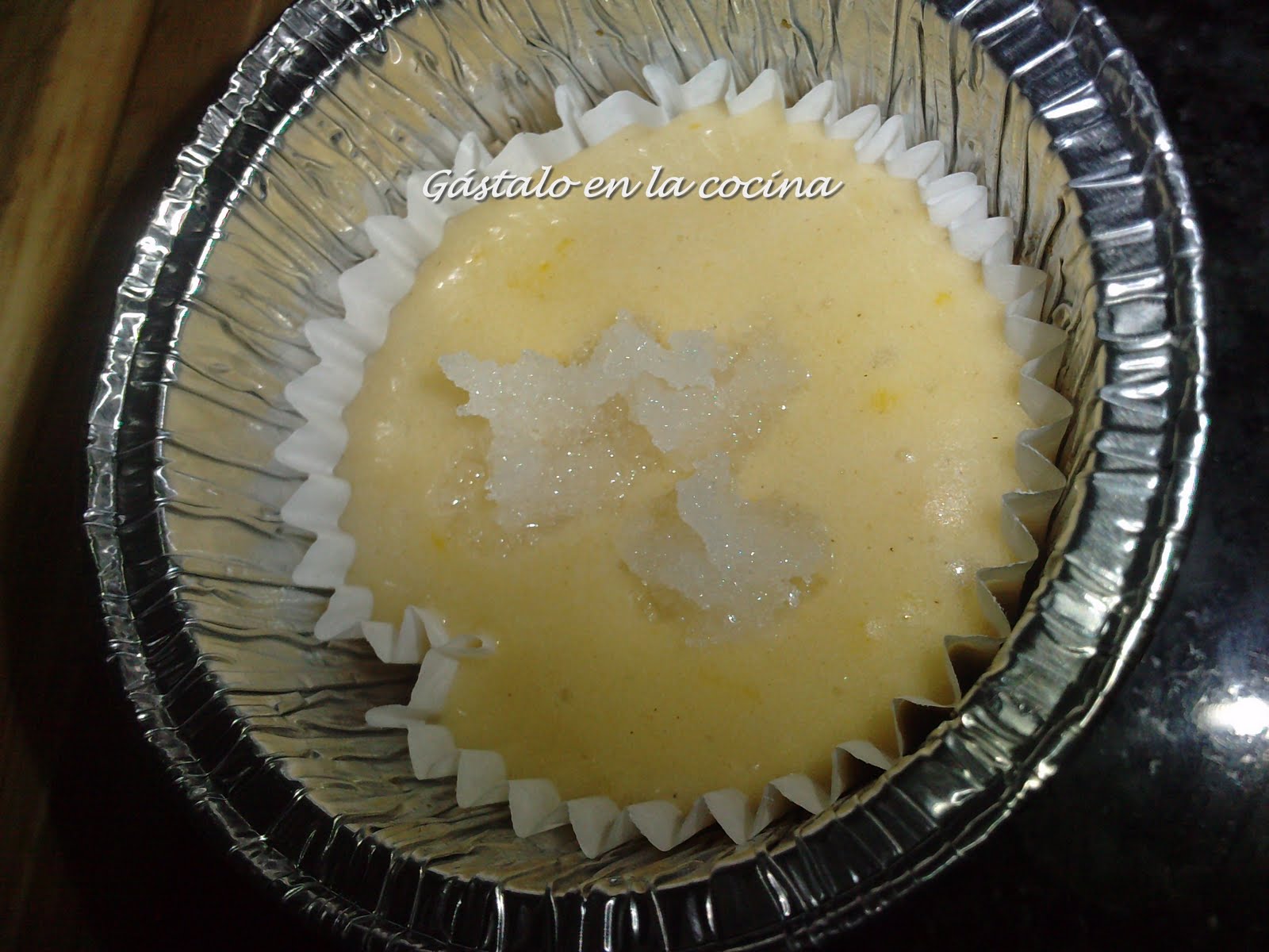 Terminamos de llenar la cápsula hasta 3/4 de su capacidad (yo las llené hasta arriba porque si os fijais el molde de aluminio sobresale mucho, y no se desbordan) Le echamos un poco de azúcar mojada en unas gotas de agua por encima.
