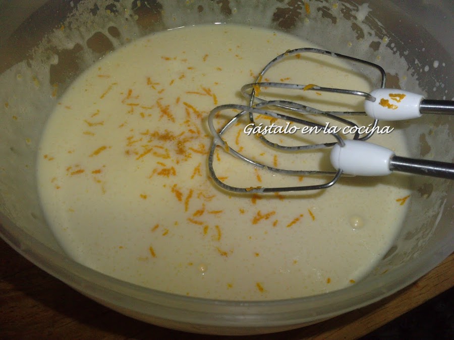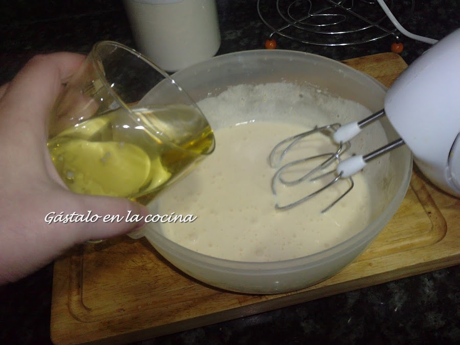 En un vaso mezclamos el aceite y la leche y lo echamos en el bol al tiempo que batimos.