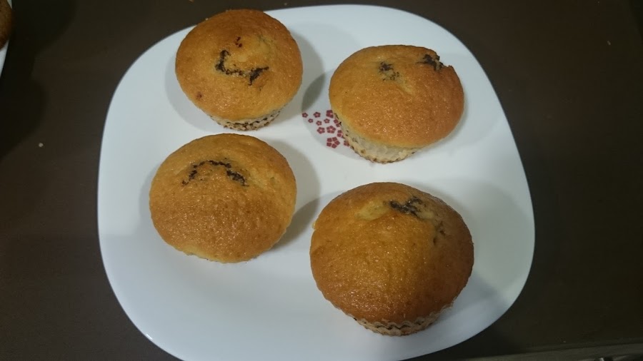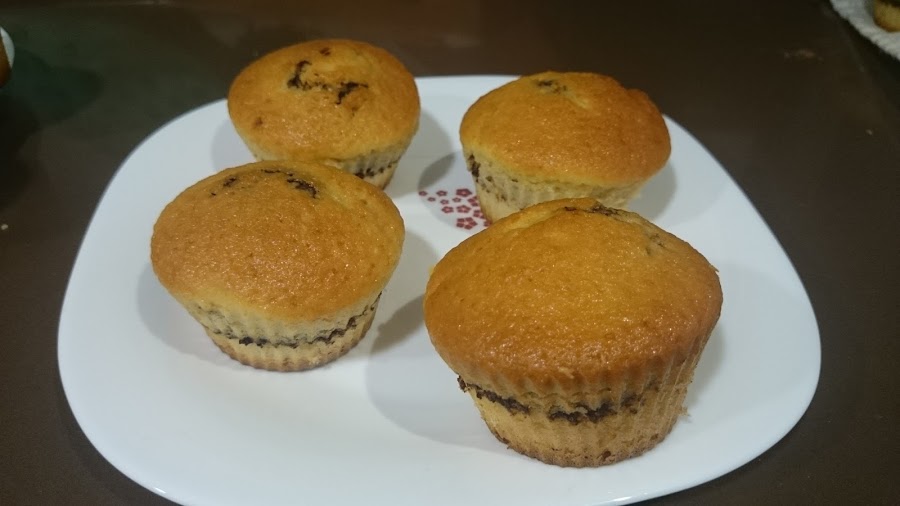 cuando tengamos la masa bien batida, a continuación encenderemos el horno a 180º para que vaya calentándose, y cogeremos los moldes para las magdalenas, yo utilizo de silicona que van muy bien, también los hay de papel pero hay que estar más pendientes porque se suelen empezar a quemar por el culo y con los de silicona no pasa, así que una vez colocados los moldes procederemos a rellenarlos, pondremos masa en un tercio del molde, a continuación pondremos el chocolate que previamente habremos rallado a virutas, yo he puesto un puñadito por magdalena y a continuación acabamos de poner masa pero sin acabar de rellenar el molde puesto que se nos saldrá fuera del molde si los llenamos mucho, cuando las tengamos todas las llevaremos al horno durante unos 20 mín. aproximadamente, IMPORTANTE no abrir el horno durante el proceso puesto que al llevar levadura sube la masa y si abriéramos a mitad cocción bajaría la masa, pasados uno 20-25 mín. aproximadamente según horno abriremos y comprobaremos que están hechas, si es así las sacamos, dejamos enfriar y desmoldamos y nada a disfrutar de una buena merienda, espero que os guste.