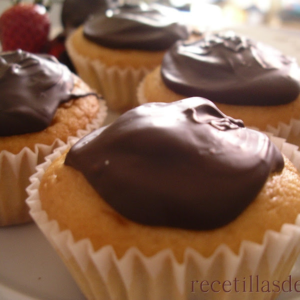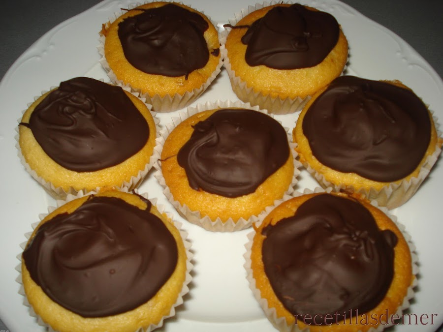 Una vez estén listas, preparamos el chocolate. Para que quede como costra de chocolate cuando se enfríe, simplemente fundir el chocolate en el microondas pero con mucho cuidado por que se puede quemar con facilidad. Una vez liquido repartir sobre la magdalenas y dejar enfriar.