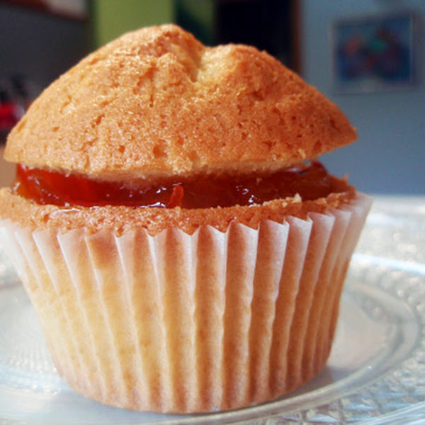 Para rellenarlas, le cortamos a la magdalena con un cuchillo un casquete en forma de cuña, como un cono invertido. Lo de la cuña es importante para que al comerlas la mermelada no se escape.