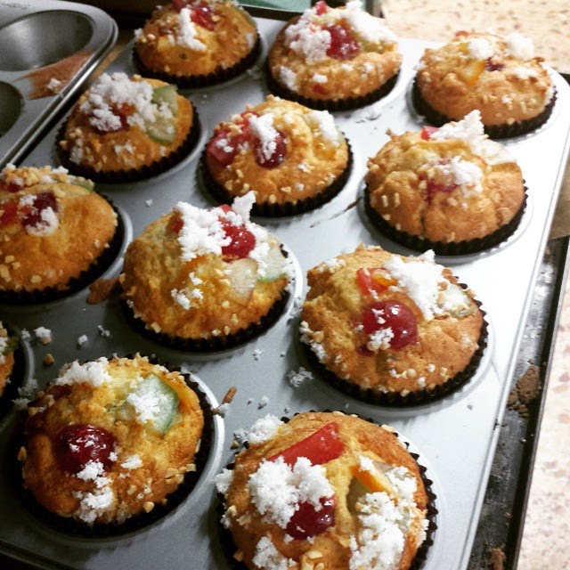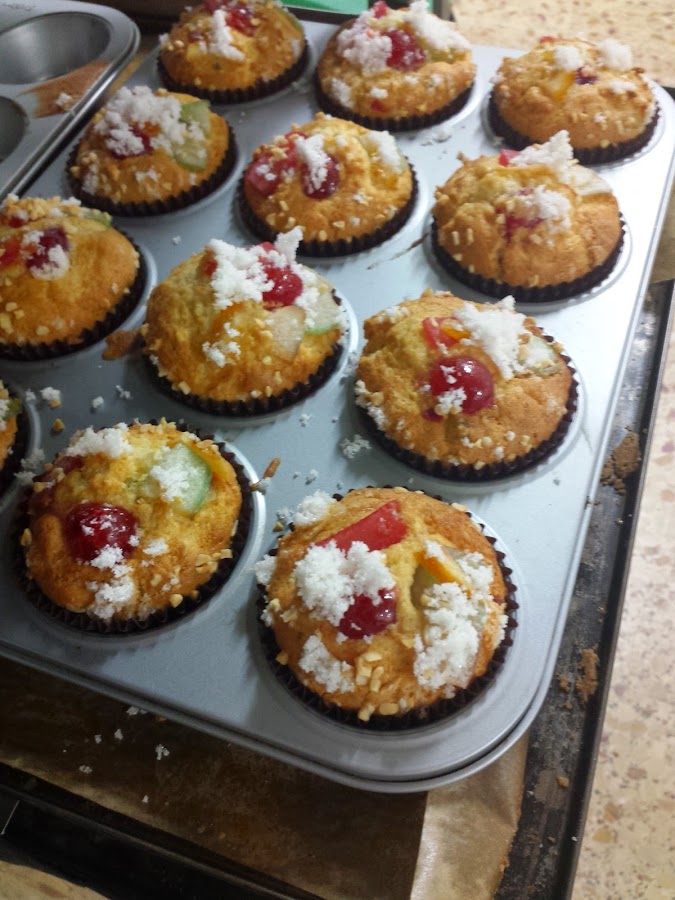 Rellenamos nuestras capsulas de magdalena ¾ partes con la masa, colocamos fruta confitada variada por encima y cubrimos con el azúcar húmedo.