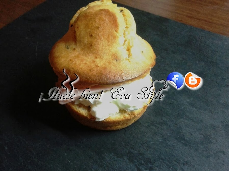 4.- Untamos la crema de queso en las magdalenas. Sobre el queso ponemos media loncha de jamón cocido doblada por la mitad. Servimos inmediatamente.