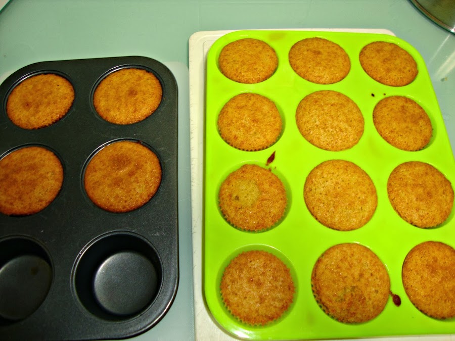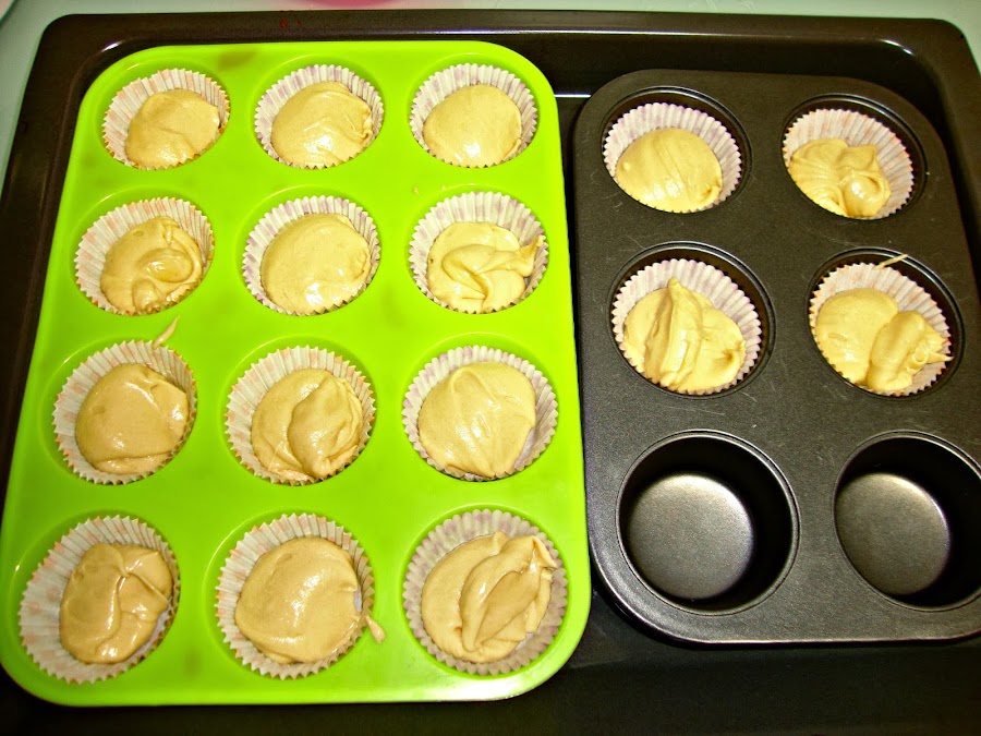 Ponemos la mezcla en las cápsulas de las magdalenas y lo ponemos en el horno caliente a 200ºC durante 5 minutos y luego bajamos a 175ºC y tenemos otros 13-15 minutos.