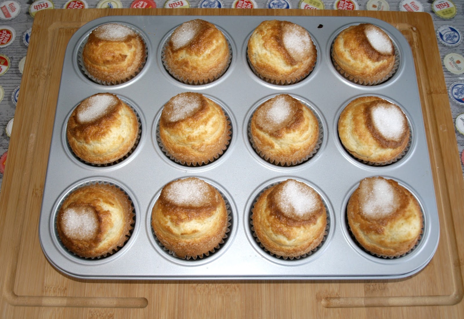- Espolvoreamos un poco de azúcar en el centro de las magdalenas y horneamos a unos 200ºC entre 15 y 18 minutos, hasta que la masa esté dorada y cocida por dentro (para verlo, pincharemos con un palillo y éste tiene que salir limpio).