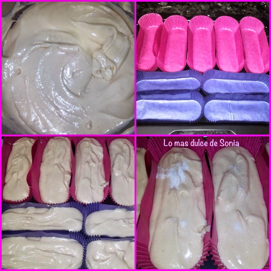 Dejamos reposar como mínimo 30 minutos. Vertemos la mezcla en los moldes. He utilizado dos papeles para cada magdalena. Cuando las coloquéis en la bandeja del horno, que estén una al lado de la otra para que no se extiendan.