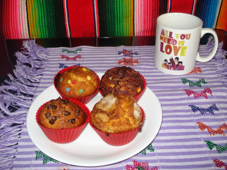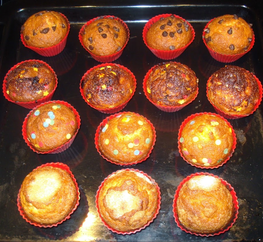 Precalentamos el horno. Añadimos la mezcla en los moldes hasta tres cuartas partes de su capacidad, espolvoreamos azúcar por encima si queréis la receta más tradicional, pero puedes ponerle pepitas de chocolate, nueces, mermelada de frambuesa, naranja o del sabor que se te ocurra.