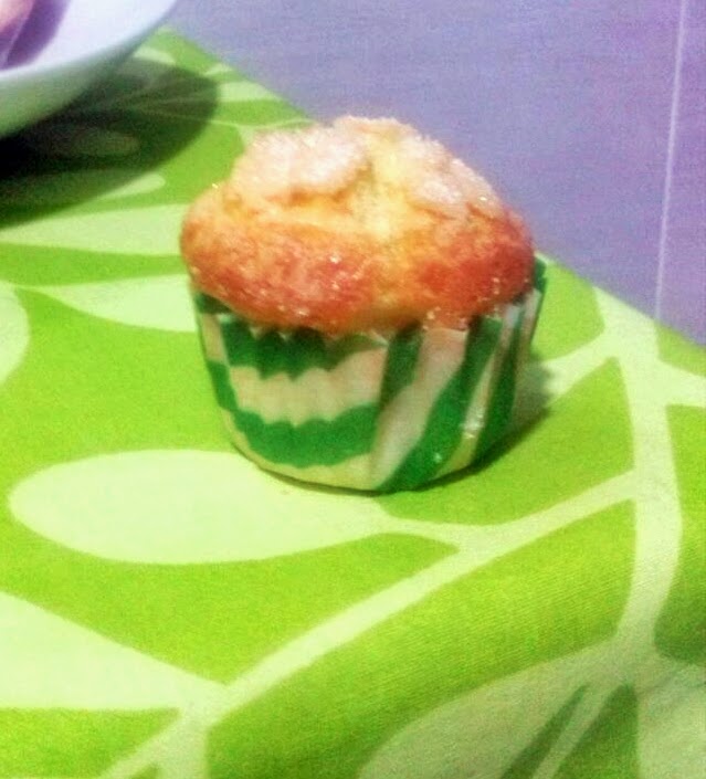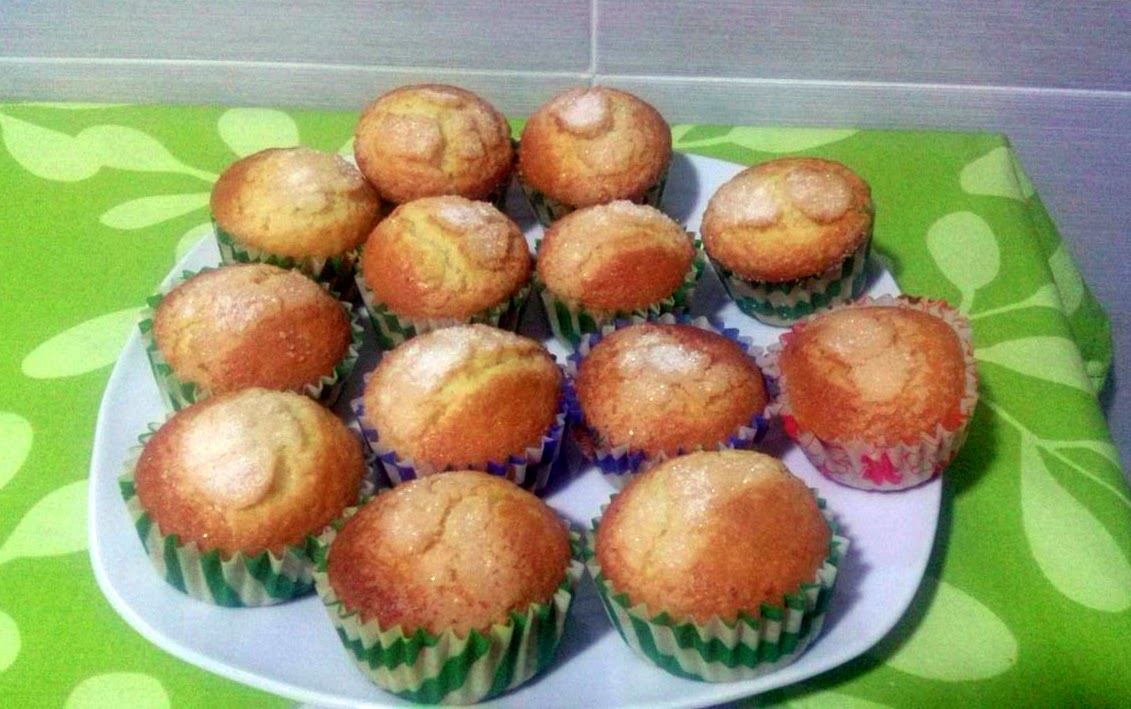 Llenar las capsulas de magdalenas (3/4 porque si no se verterá la masa), espolvorear con azúcar y calentar al horno durante 14-16 minutos a 210º (hasta que estén doradas).