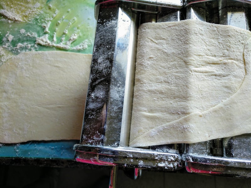 Con ayuda de una máquina de hacer pasta (aunque podéis hacerlo también con un rodillo), hacéis una tira de masa muy finita (en mi máquina la he dejado en el 5, pues si subía más se rompía).