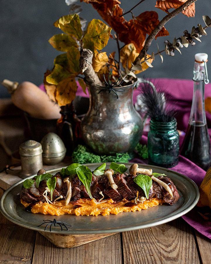 Al ser el magret el plato principal nos gustó la idea de presentarlo entero, con una puesta en escena propia de los banquetes de época con bandejas llenas de comida y presentaciones recargadas.
