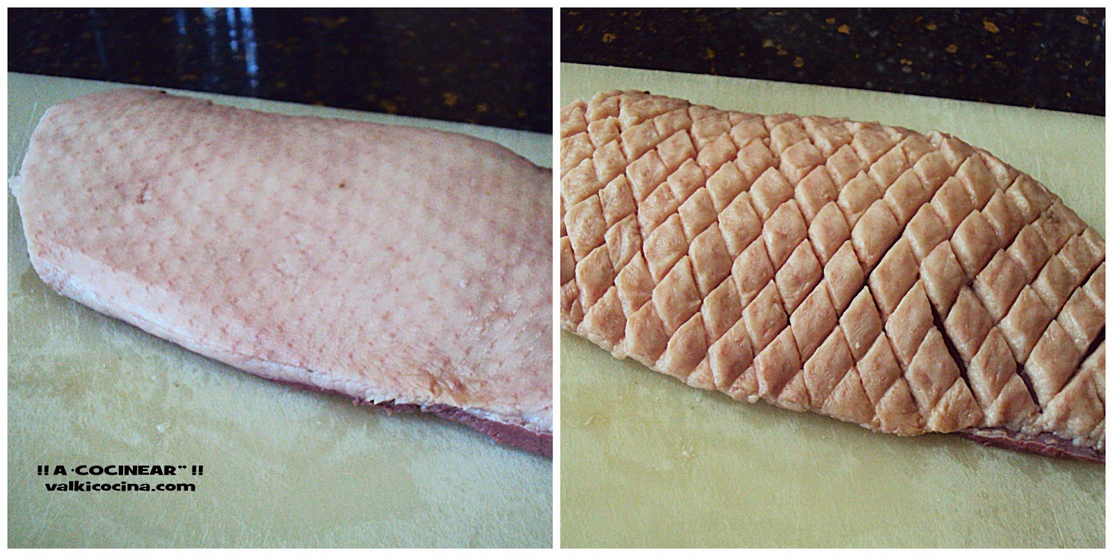 Una vez limpio de exceso de grasa o piel, Hacemos unos cortes en diagonal de forma que nos quede la característica rejilla. Ten cuidado de no cortar la carne, sólo la piel y la capa de grasa.