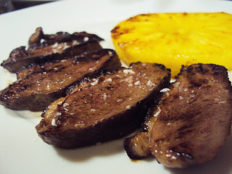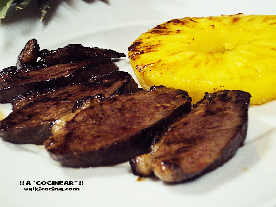 Aunque tiene una capa de grasa entre la piel y la carne, en su elaboración desaparece casi por completo; .. y si no eres de carne poco hecha, ( como pasa en casa ), te doy la clave de como conseguir que sin perder jugosidad, quede a tu gusto.Queda estupendo si lo acompañamos con guarniciones con toque dulce como por ejemplo compota de manzana; .. o como en este caso, .. unas sencillas y deliciosas rodajas de piña asada.