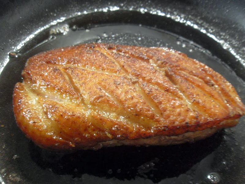 En una sartén o cazuela plana, colocar el magret con la piel hacia abajo unos 5 minutos si se quiere un poco crudo y unos 8 minutos un poco más hecho, y dar la vuelta el mismo tiempo. Sacar y reservar.