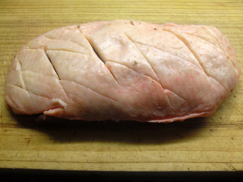 Hacer unos cortes en la piel con un cuchillo bien afilado, en diagonal hacia la izquierda y repetir la operación hacia la derecha, como un enrejado o rombos. Salpimentar.