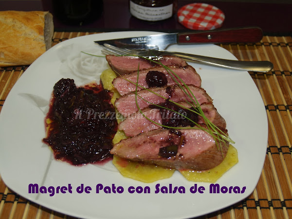 Mientras el Magret se hace, vamos a elaborar la salsa de Moras para ello picaremos muy fino el puerro y lo pondremos a sofreír en una sartén o cazuela de fondo grueso, cuando el puerro este blandito le añadimos la mermelada de moras, subimos el fuego y cuando hierva bien le añadimos el vino tinto, dejaremos a fuego medio bajo para que evapore el alcohol y reduzca la salsa, cuando haya reducido le añadiremos unas moras enteras para dar textura a la salsa..
