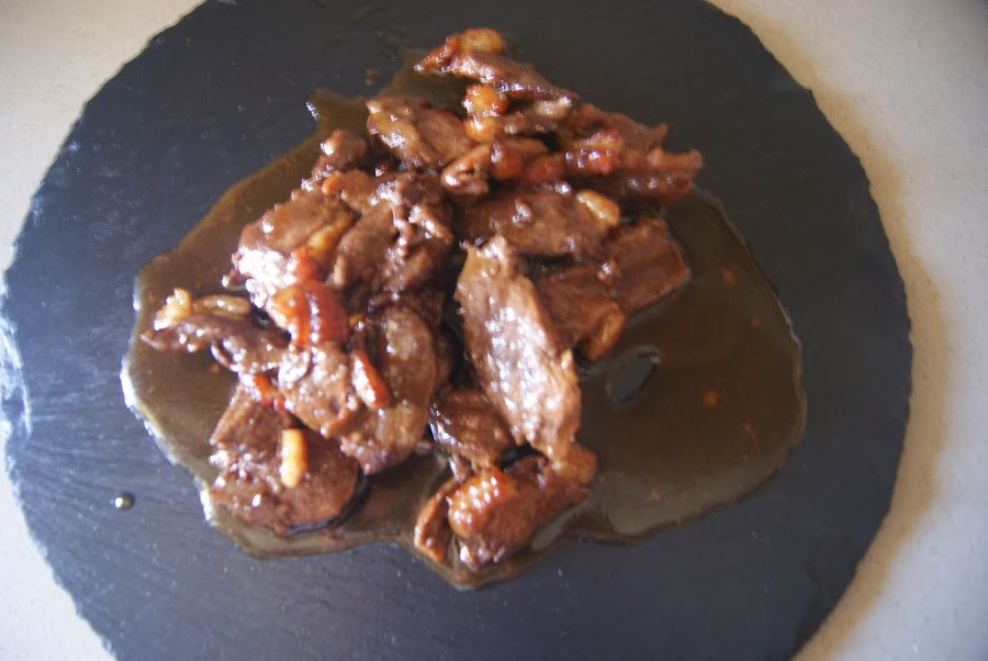 Seguimos con el paso final, corta el magret en lonchas finas. En la sartén pon al fuego la mantequilla y cuando está derretida le incorporas la carne fileteada, la salsa de soja-oporto y saltea a fuego vivo unos dos minutos. Listo para servir.