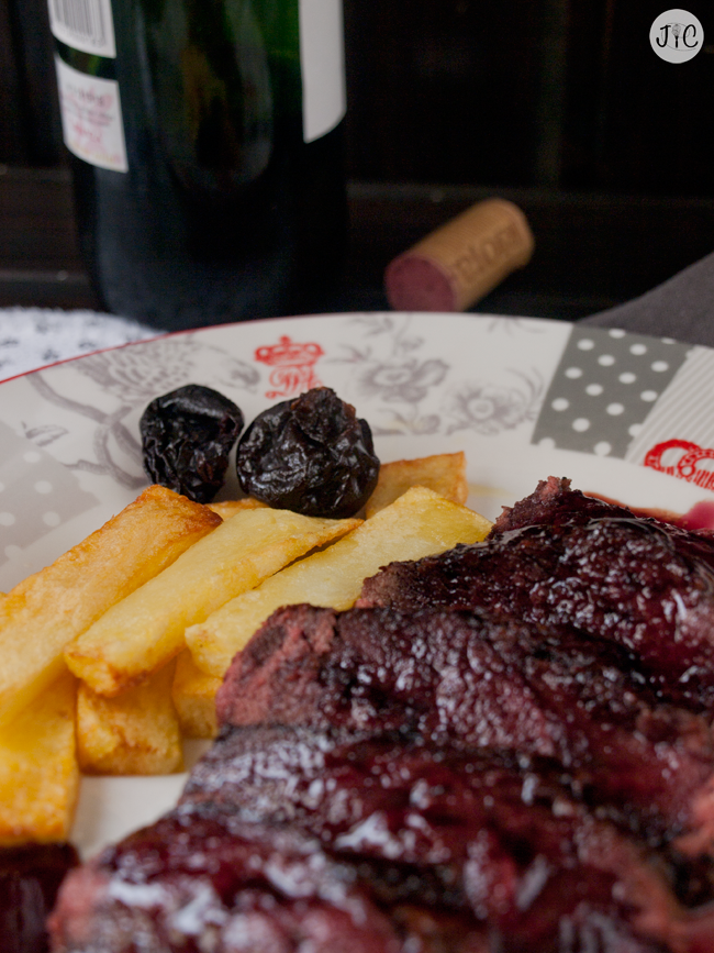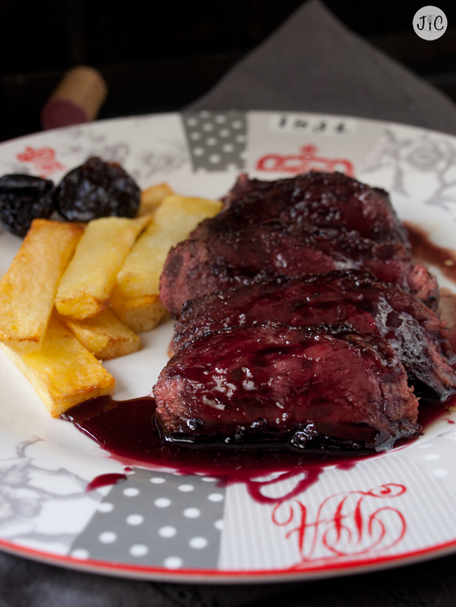 - Servimos el pato caliente y cortado en lonchas, acompañado de las patatas y de la reducción de vino tinto. Yo lo he acompañado con unas ciruelas pasas.