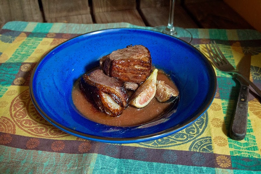 Cortamos el magret en trozos grandes y emplatamos en medio de una cama hecha con la salsa de naranja y brevas. Servimos bien caliente.