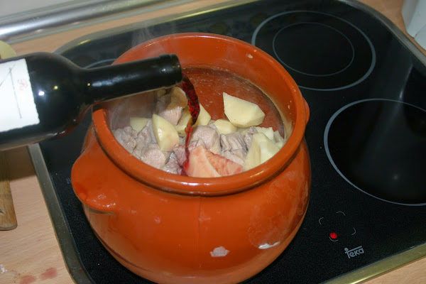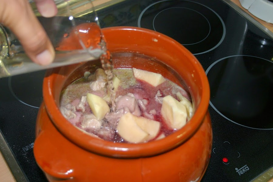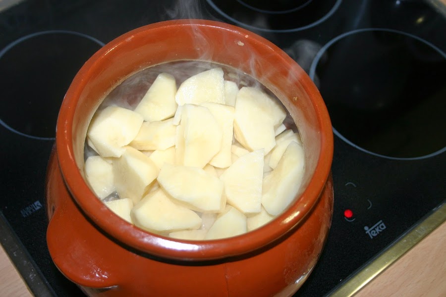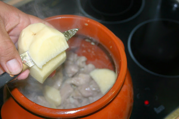 una vez este sellado pelamos las patatas y las desgarramos para echarlas a la olla
