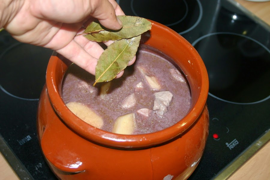 metemos las hojas de laurel y lo ponemos a hervir a fuego alto, cuando rompa, lo bajamos y dejamos que hierva a fuego medio hasta que se haga