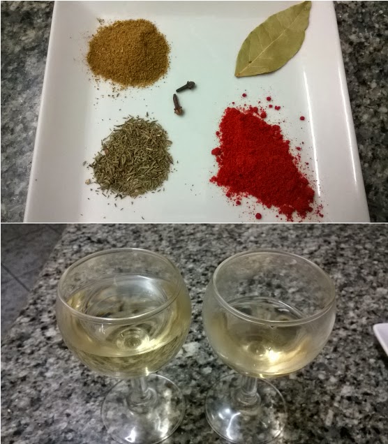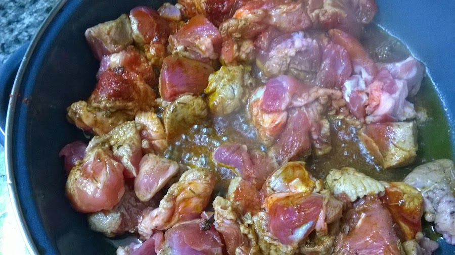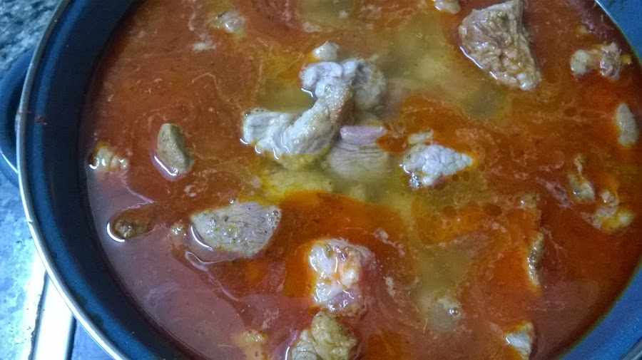 Le añadimos las especies, el Vino y el Vinagre, dejamos reducir y añadimos agua, cubriendo la carne.