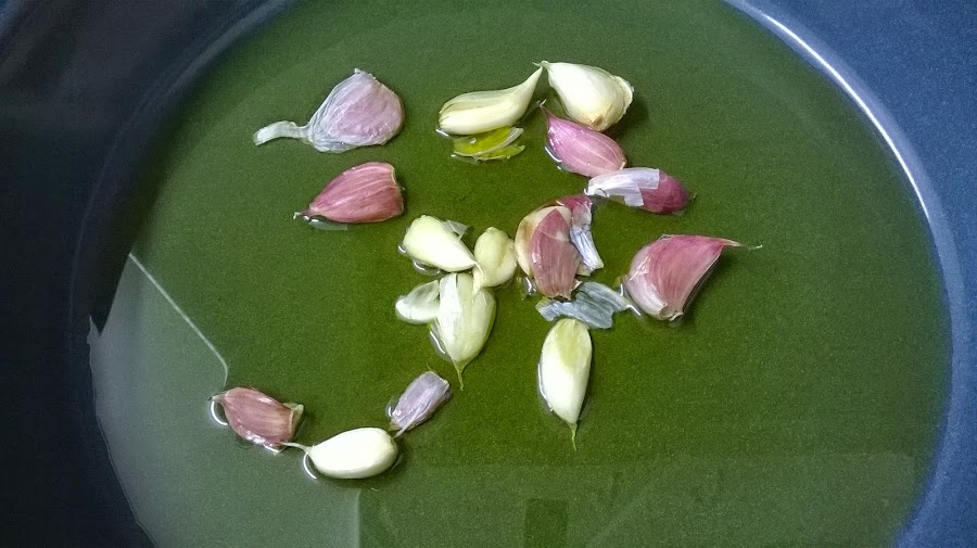 En una cazuela, ponemos a calentar el Aceite de Oliva, y vamos friendo los ajos en el, cuando este frito bien dorado, los sacamos y reservamos.