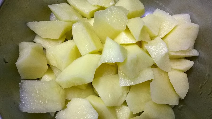 Mientras tanto, pelamos las patatas y cortarlas en Cachelos pequeños y la reservamos metidas en agua fría.