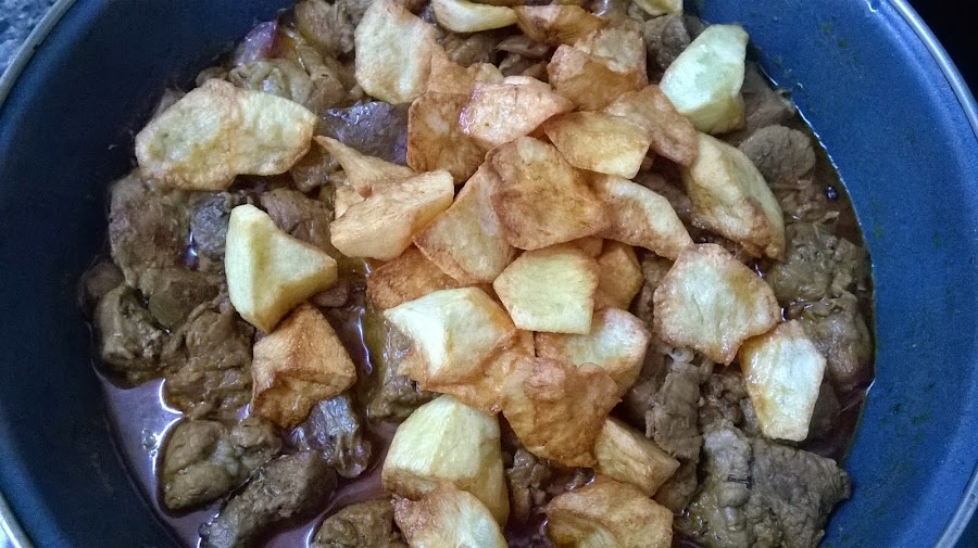 Una vez fritas las patatas, las vamos añadiendo a la carne y ligándola para que tomen un poco el sabor de la Salsa, apartamos y servimos en platos individuales.