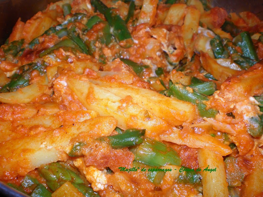 Mezclar en una olla o sartén grande las patatas fritas, escurridas de aciete y los espárragos.