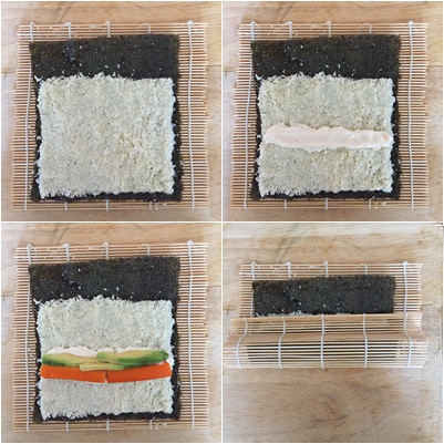 Enrollar la hoja de nori con la esterilla empezando por el lado que tiene coliflor. Ir formando un rollo muy apretado.* el relleno lo podemos sustituir por salmón, atún, zanahoria, pepino, lo que mas nos guste; Y podemos dejar los rollos preparado con anterioridad pendiente de cortarlos al momento de servir.
