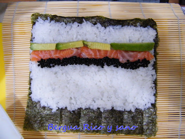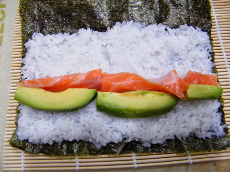 6. Os cuento el proceso y más abajo hablamos de las combinaciones que probamos nosotros. Hacia la mitad del arroz colocamos tiras de ingredientes en sentido paralelo a nosotros. Si somos cocineros de esos que lo pringan todo, mejor tener papel de cocina transparente (film) sobre la alfombrilla de bambú.