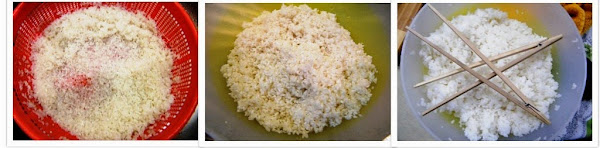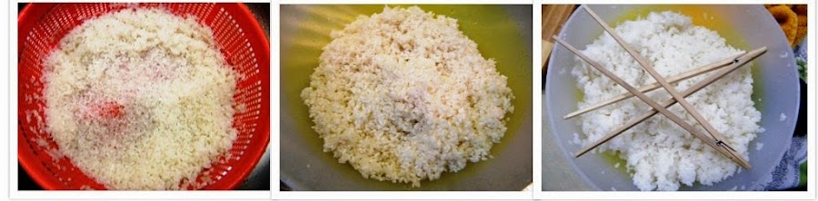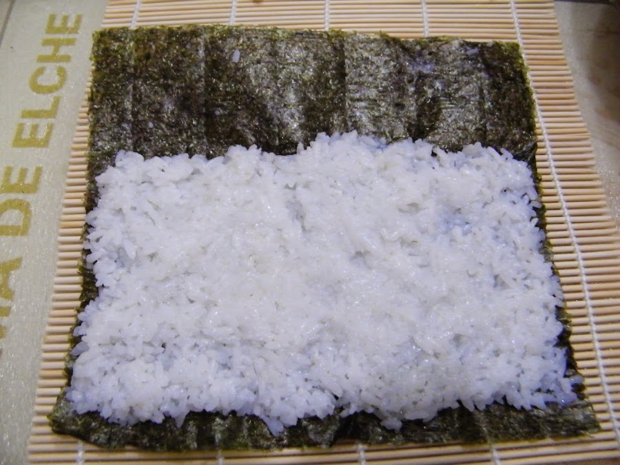 4. Lo siguiente es mezclar el arroz con su aliño con el azúcar y la sal disueltos en él. Es el líquido amarillo que veis en la foto de la izquierda. Yo fui mezclando y probando de sabor hasta estar satisfecha. Usé unas 6-8 cucharadas. 5. Extendemos una alga nori sobre nuestra alfombrilla de madera con la cara brillante hacia abajo y las líneas de corte perpendiculares a nosotros. Tendremos cerca el cuenco de arroz y un cuenco con agua para mojarnos los dedos y trabajar mejor con el arroz. Cubrimos de arroz la lámina entera excepto por los 3 cm superiores. Podemos ayudarnos de un tenedor, pero sin chafar demasiado.