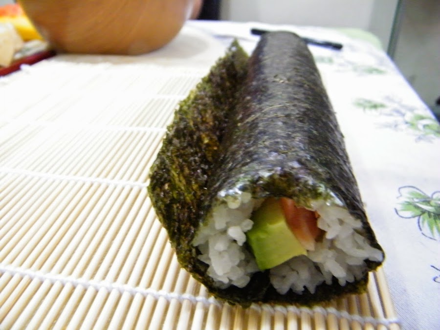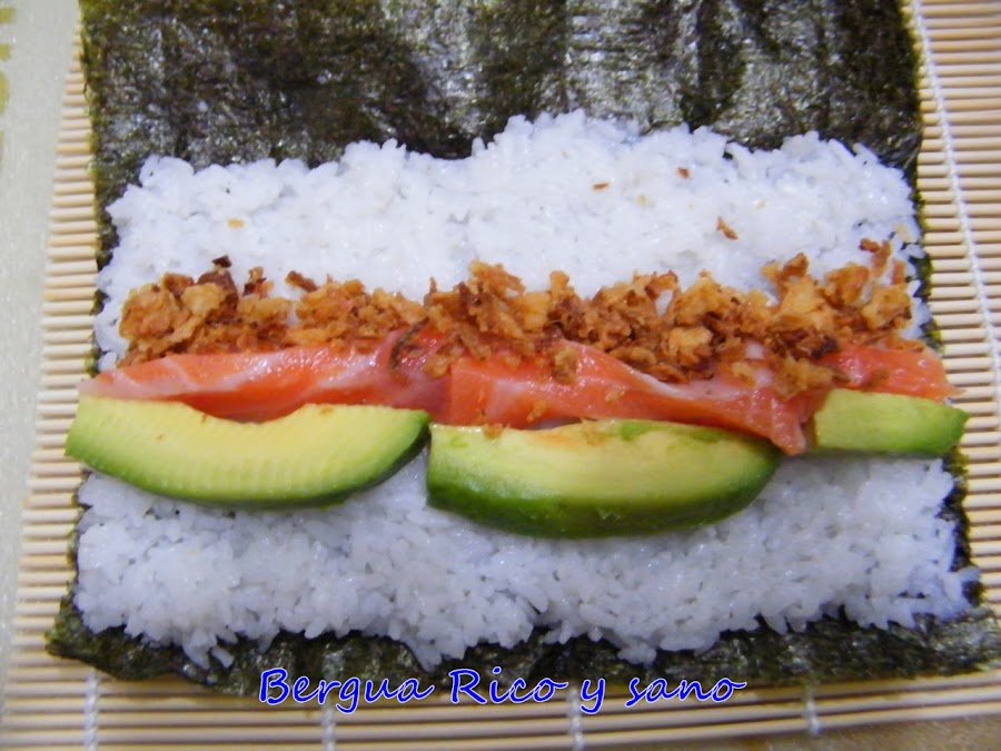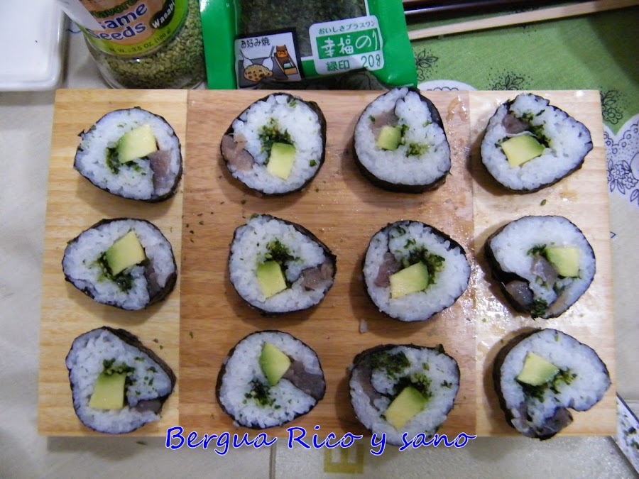 Hicimos otro de atún, pepino, algas secas y zanahoria. Muy rico también; las algas me encantan y la zanahoria aporta textura y color. La comida japonesa consiste en gran medida en un juego estético.