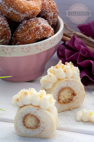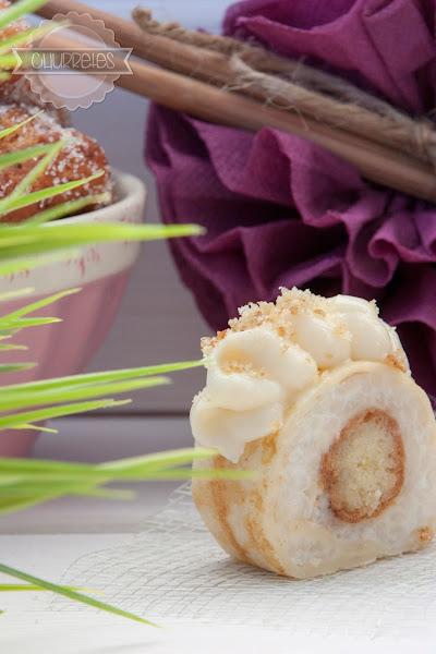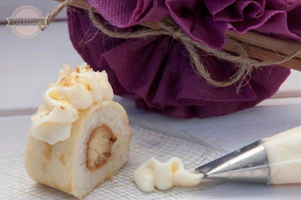 En el extremo por el que vayamos a empezar a enrollar el crepe, poner un cordón de crema (yo con la manga y boquilla redonda), un palo de rosquilla, que cubra todo el largo del rulo, y luego otro cordón de crema.
