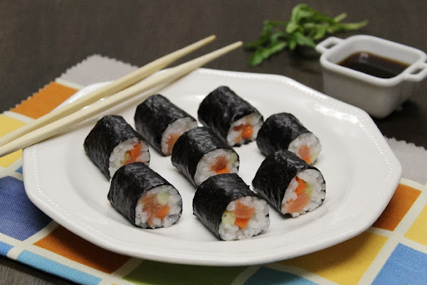 4. Ahora que ya tenemos todo preparado toca hacer los rollitos. Necesitaremos una esterilla sobre la que colocaremos una lámina de papel film para ayudarnos a dar forma a los makis. Encima ponemos el alga nori partida a la mitad, con la parte rugosa hacia arriba. Sobre ella extendemos el arroz ayudándonos con las manos, dejando un centímetro libre en la parte superior e inferior del alga. Para que el arroz no se pegue demasiado a los dedos mojamos las manos con agua cada vez que lo manipulemos. Continuamos añadiendo el relleno en el centro, es decir, las tiras de pepino, zanahoria y salmón. También podéis añadir una pizca de wasabi, ponéis un poquito en la yema del dedo y lo estendéis sobre el arroz como si dibujaseis una raya con él. Enrollamos con la ayuda de la esterilla, asegurándonos de que el alga queda bien cerrada para que no se escape nada. Seguimos haciendo rollos hasta terminar los ingredientes.