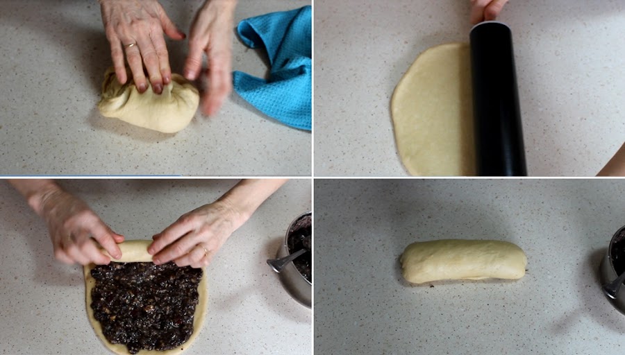 Una vez que la masa haya levado, la estiramos con el rodillo en forma rectangular y la rellenamos con el relleno. La vamos enrollando como si se tratara de un brazo de gitano. Remetemos bien los extremos hacia dentro.