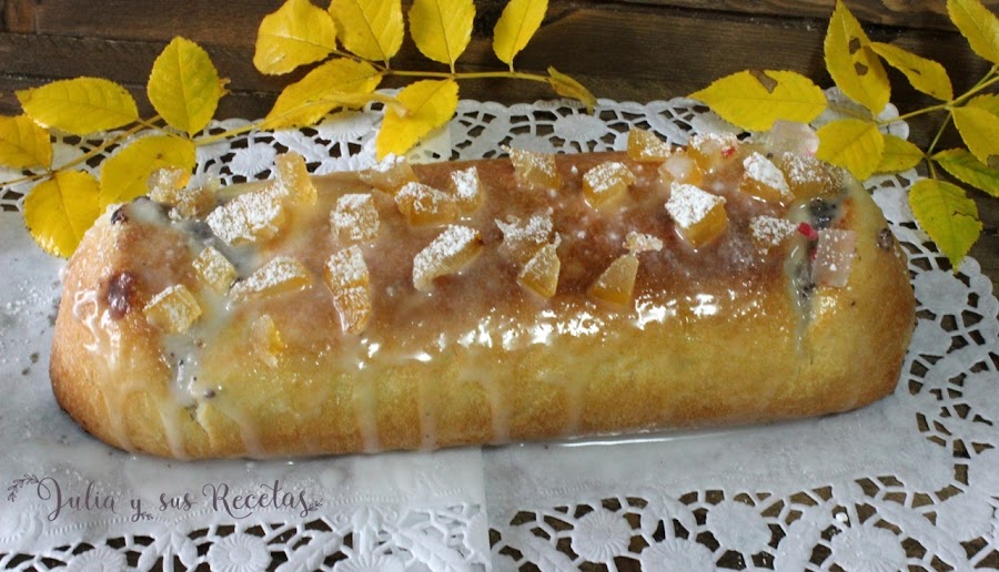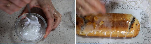 Hacemos la glasa mezclando el azúcar con zumo de limón hasta formar una masa espesita...la ponemos encima del roll y lo espolvoreamos con nueces picada o almendra laminada.