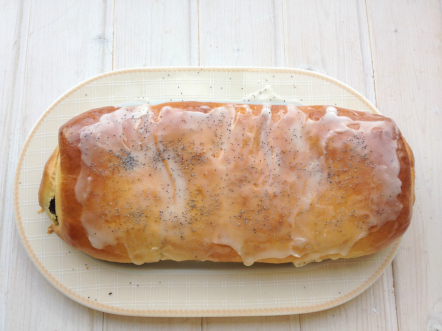 5. Estiramos la masa con ayuda de un rodillo, en forma de rectángulo. Extendemos el relleno de semillas de amapola sobre la masa sin llegar al borde, dejamos sobre 1 cm por cada lado sin semillas. Doblamos los dos lados largos hacia adentro, para que los remates queden más curiosos. Enrollamos cuidadosamente empezando por uno de los lados cortos, hasta completar el rollo, queda como un brazo de gitano. Ponemos en una bandeja de horno cubierta con papel, cubrimos el rollo con un paño de cocina, y dejamos reposar en un sitio cálido durante 1 hora.
