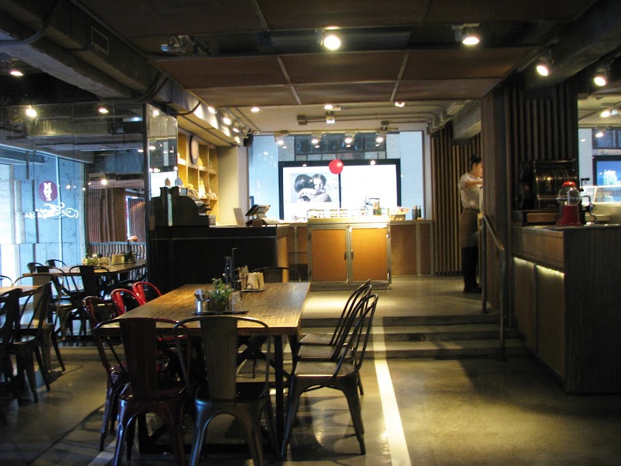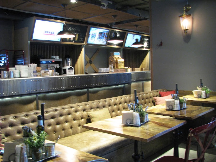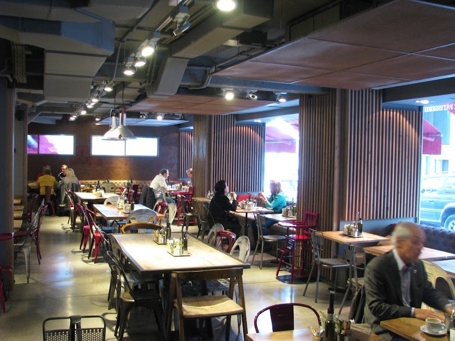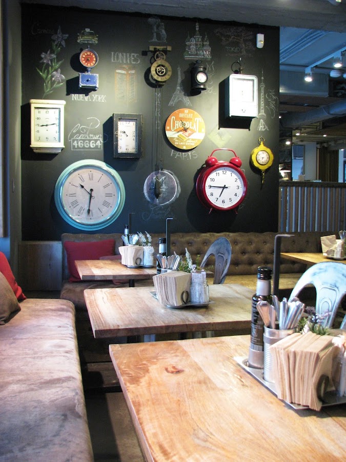 Es un local bastante amplio, dividido en la barra y mesas para tomar algo y la pastelería para llevar. La decoración es muy moderna y sencilla, inspirada en Nueva York, con una luz bastante agradable y mucha amplitud. El personal que nos atendió fue muy amable con nosotros, al hacer tu pedido en la barra te dan una letra o número con un imán para colocar en tu mesa y, en cuanto esté preparado, te lo acercan a tu mesa.