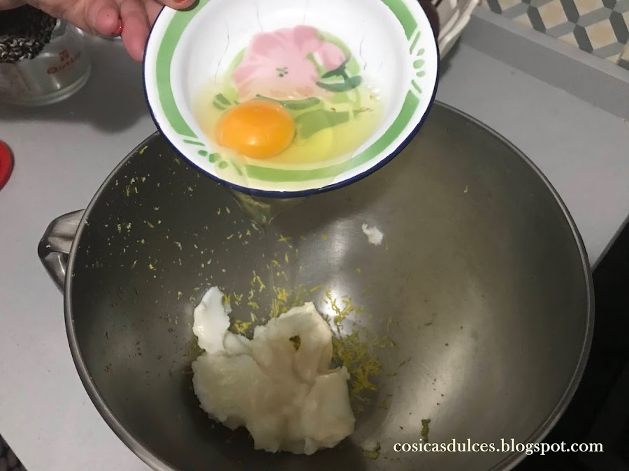 En un bol colocamos la manteca, la ralladura, los huevos y el vino blanco.
