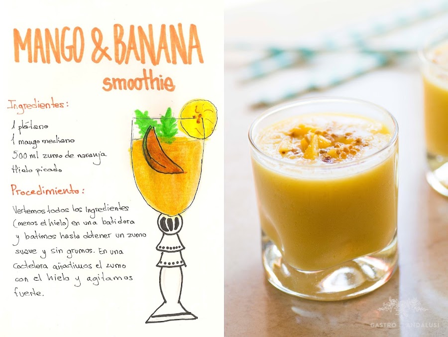 Ingredientes; 1 plátano, 1 mango mediano, 500ml de zumo de naranja, hielo picado Procedimiento; Vertemos todos los ingredientes en una licuadora y batimos hasta obtener un zumo suave y sin grumos. Añadimos el hielo picado, movemos y servimos.