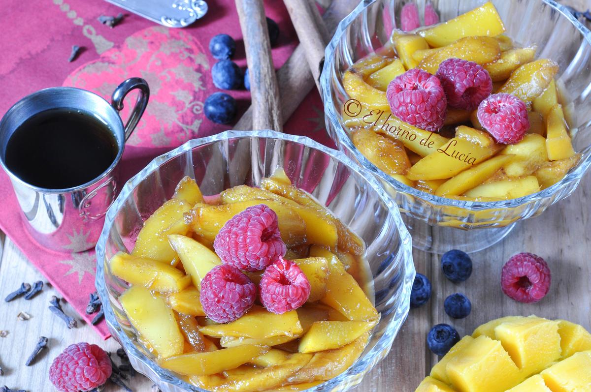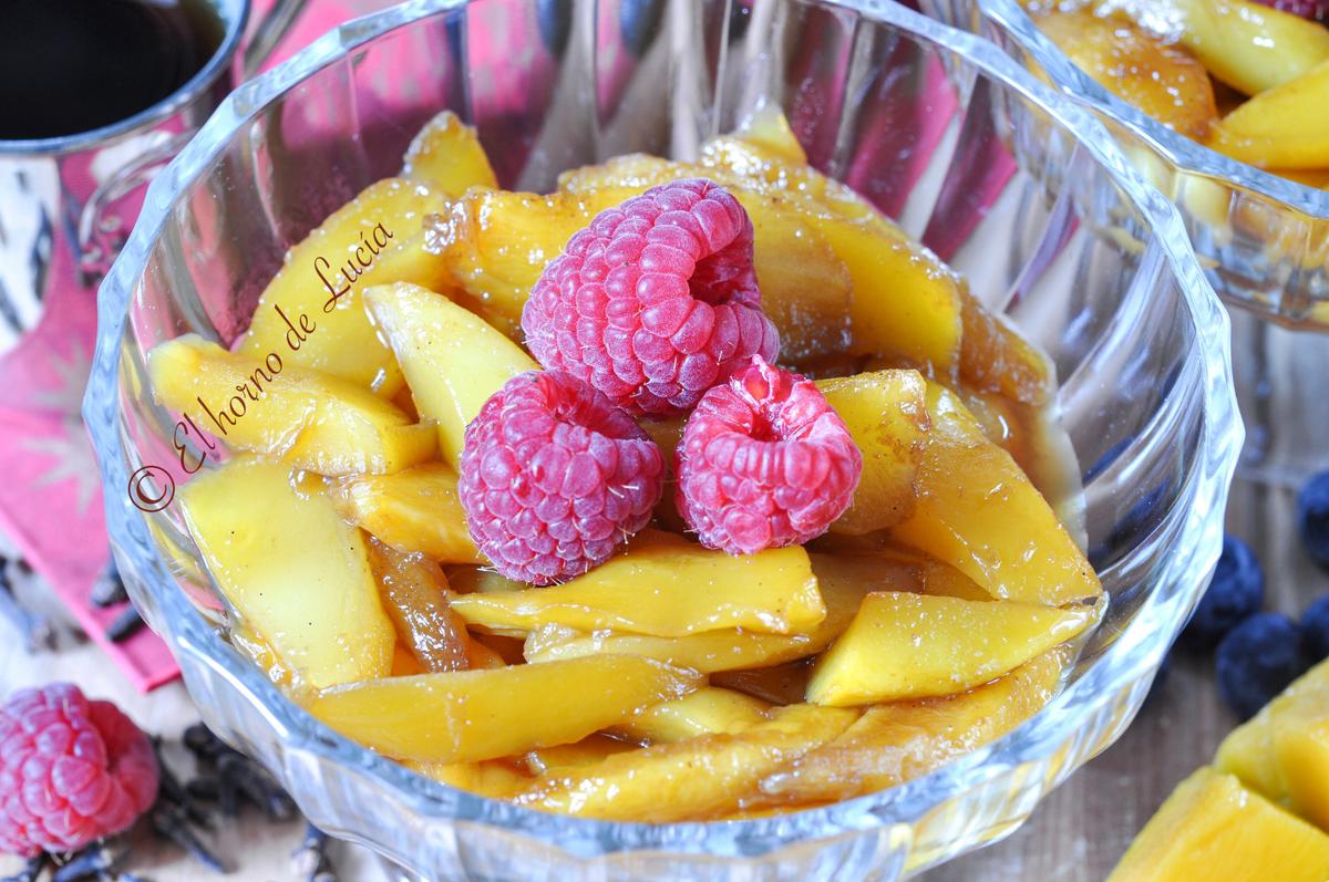Podéis preparo con antelación y guardar el mango en el propio almíbar en un recipiente bien hermético. A la hora de tomarlo sólo tenéis que presentarlo donde vayáis a servirlo y decorar con las frutitas por encima.