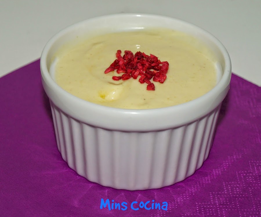 - Lo añadimos a la mezcla anterior y volvemos a batir hasta que quede totalmente integrado. Probamos y añadimos más azúcar o cardamomo si nos hace falta, y llenamos los recipientes que nos guste. Yo probé en copa de postre y en pequeños ramenquines, que me encantan, y los adorné con unas frambuesas desecadas, que además les aportaron un aroma estupendo. Metemos a la nevera a enfriar unas horas, para que esté bien fresquito y de perfecta consistencia y a degustar! Un postre sano, light, fácil y sobre todo delicioso.