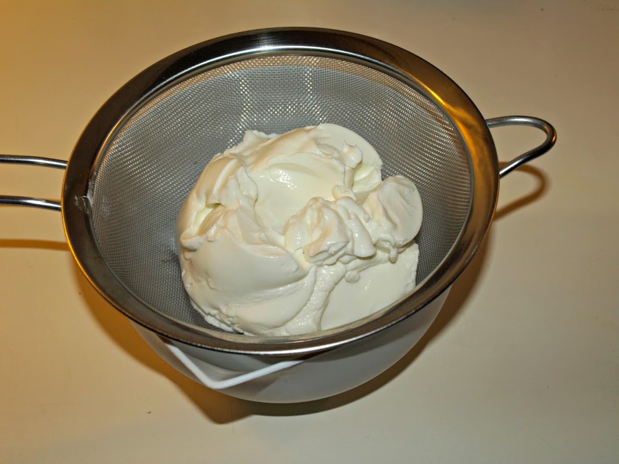 - Lo primero que hay que hacer es "colgar" el yogur. Es literalmente como se traduce el nombre, como yogur colgado, porque se "cuelga" en una tela para exprimir todo el suero y que quede una consistencia muy espesa. Yo no tenía una tela adecuada, así que utilicé un colador. Lo dejé escurriendo unas horas, hasta que vi que ya no goteaba más.